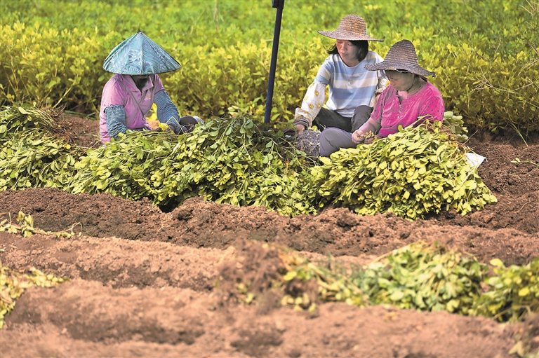 35℃高温,几位菜农顶着烈日徒手采摘花生。