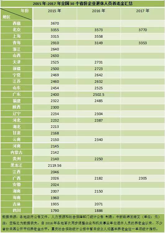 据目前已有的公开数据显示,西藏、北京、上海、青海四个地方的企业退休人员月均养老金均已超过3000元,排在全国前列;四川2015年、2016年企业退休人员月均养老金均未超过2000元,排在全国垫底位置。