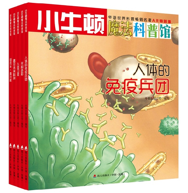 “小牛顿”为华语世界极具影响力的原创科普品牌。本次海天出版社引进的“小牛顿魔法科普馆”是小牛顿的第一套AR科普绘本。该丛书从“小牛顿”系列读物参考先进国家同阶段科学教育课程素材取舍选题,精选最适合4-7岁年龄段儿童的30个主题,内容涉及动植物、自然奥秘、尖端科技、人体健康、生活常识等,深度融合“小牛顿”的优质科普内容和顶尖团队梦想人科技在“AR+教育”数字出版领域的丰富经验和先进技术,引导孩子以更多元的方式探索世界。小牛顿魔法科普馆之 “科学的魅力”分为《光和色彩》《人体的免疫兵团》《人造卫星》《坦克车·直升机》《遇见未来科技》5册。