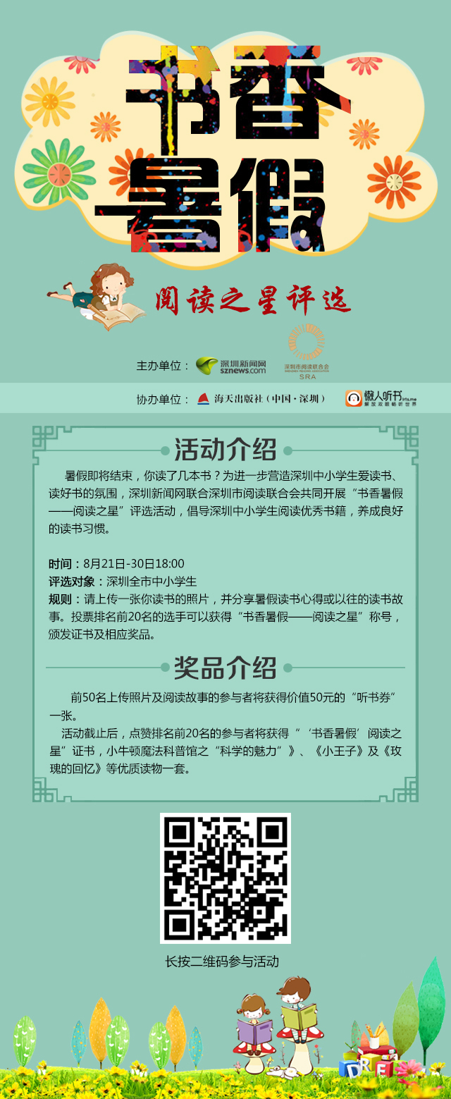 届时,全城网友将票选出最动人的阅读故事前20名,将获得由深圳新闻网与深圳市阅读联合会颁发的“‘书香暑假’阅读之星”证书,终极大奖是由海天出版社提供价值210元的优质读物一套。