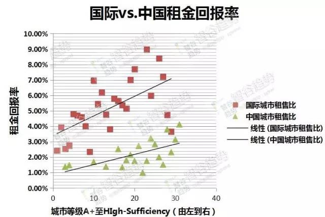 在每个等级,中国城市的租金回报率都低于国外城市,其整体分布如下图: