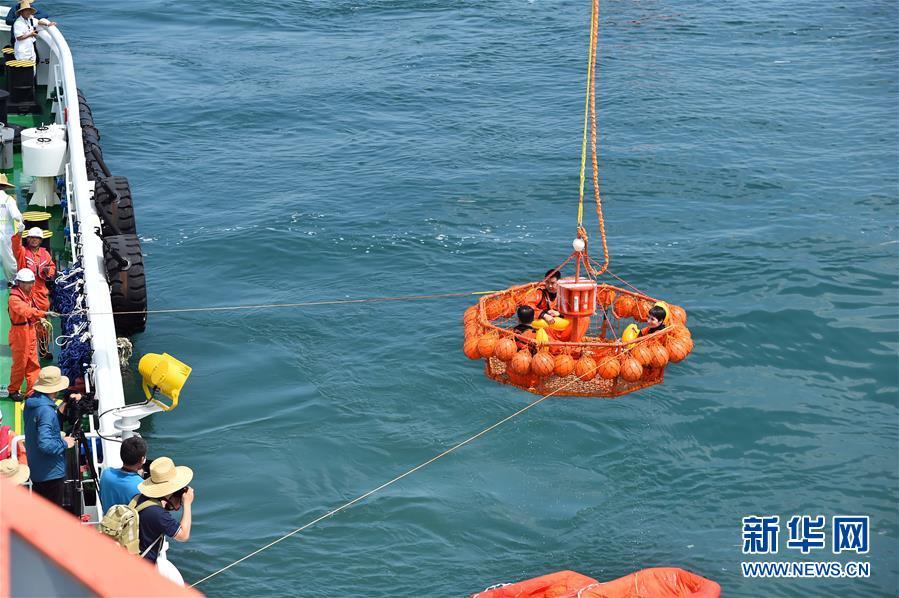 8月21日,参加海上救生训练的航天员通过救生吊篮“获救”。