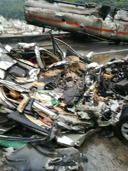 23日19点左右,云南昆石高速昆明方向K49+500M(清水沟路段)发生4车相撞的交通事故,一辆油罐车先与一辆小车碰撞后,冲入对向车道,又与对向两辆小车相撞,现场一辆轿车被撞受损后已成废铁。