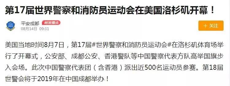 巧合的是,据锐参考了解,这一香港警察在开幕式上的表现是当时参加该运动会的成都公安代表亲眼目睹的。@平安成都介绍说,中国大陆警察代表团中,很多运动员即是成都公安代表。