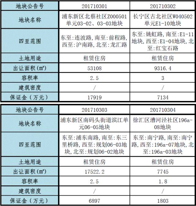 根据出让公告,这四幅地块分别位于,浦东北蔡地块,出让面积约为5.3万平方米;浦东南码头街道地块,出让面积约为1.75万平方米;长宁古北地块,出让面积约0.93万平方米;以及徐汇漕河泾地块,出让面积约为0.77万平方米。