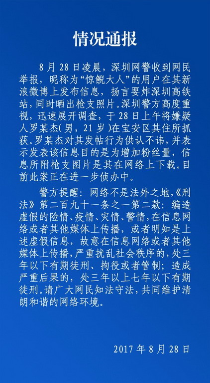 深圳新闻网讯 8月28日凌晨,深圳网警收到网民举报,昵称为“惊鲵大人”的用户在其新浪微博上发布信息,扬言要炸深圳高铁站,同时晒出枪支照片。深圳警方高度重视,迅速展开调查,于28日上午将嫌疑人(罗某杰,男,21岁)在宝安区其住所抓获。罗某杰对其发帖行为供认不讳,并表示发表该信息目的是为增加粉丝量,信息所附枪支图片是其在网络上下载。目前此案正在进一步侦办中。