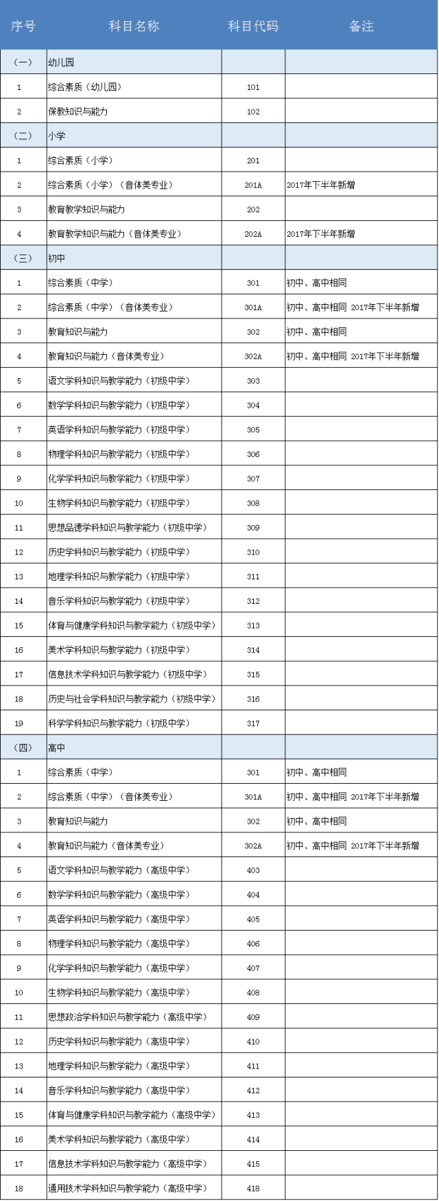 7.按照《教育部教师工作司关于中小学教师资格考试音、体、美专业考生公共科目单独编码的通知》(教师司函〔2017〕34号),从2017年下半年考试开始,对音、体、美专业考生的笔试公共科目一、科目二(科目代码:201、202、301、302)实行单独编码(相应科目代码:201A、202A、301A、302A),考试内容暂与原科目相同。实行单独编码后,音、体、美专业考生在笔试报名时应选报单独编码的公共科目。取得科目201A、202A合格的考生,面试仅限于参加小学类别音、体、美专业科目;取得科目301A、302A合格的考生,面试仅限于参加初中、高中、中职类别音、体、美专业科目。考生已获得科目201、202、301、302合格成绩,可相应替代科目201A、202A、301A、302A合格成绩;考生已获得科目201A、202A、301A、302A合格成绩不可替代科目201、202、301、302合格成绩。