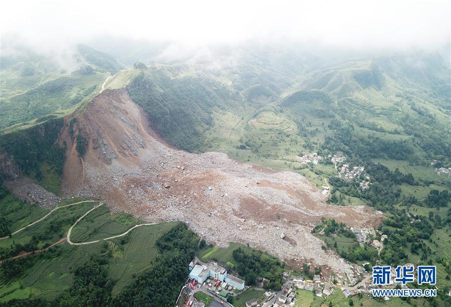 航拍山体滑坡现场(8月29日摄)。截至8月29日16时30分,贵州省纳雍县山体崩塌地质灾害救援现场已搜救出25人,其中17人死亡、8人受伤,目前尚有18人失联。据悉,崩塌山体距离灾害地垂直落差约200米,崩塌岩体约为60余万立方米。灾害发生后,当地组织专业力量全力以赴昼夜不休开展救援。新华社记者陶亮摄