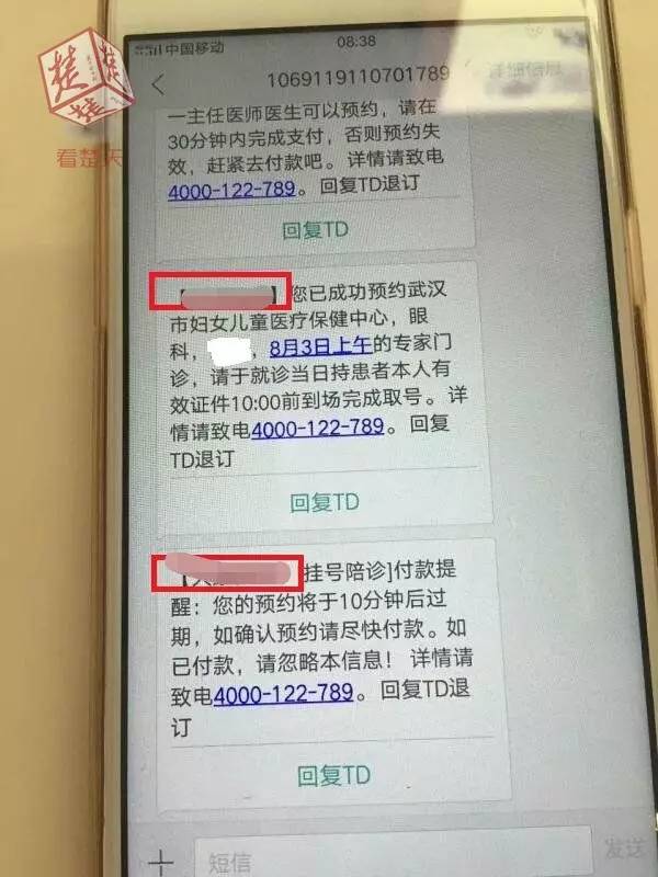 挂号成功后,她收到网站推送的短信提醒显示“您已成功预约武汉市妇女儿童医疗保健中心的眼科,8月3日上午的专家门诊,请于就诊当日持患者本人有效证件,10:00前到现场完成取号”。
