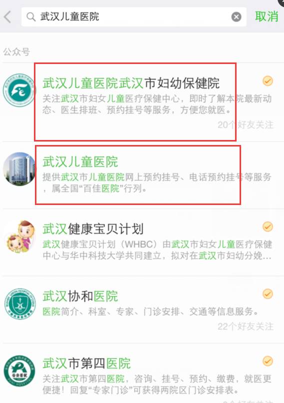 以武汉儿童医院为例,首先要关注该医院的公众号,在搜索的时候我们发现出来了两个↓