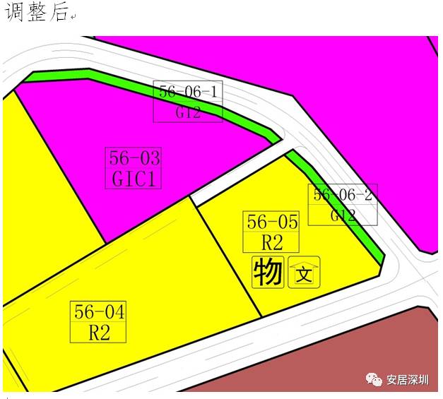 (一)拟将56-05地块用地面积由4489㎡调整为4125㎡;容积率由3.1调整为5.95;取消绿地率指标,按《深标》要求落实绿化覆盖率;增加规划配套设施物业服务用房和文化活动室;备注“规划, 本地块为保障性住房,按政府有关要求实施”。