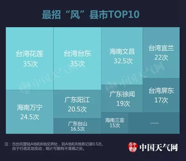 如果更精确一点,最招风的10大县市全部都集中在台湾、海南、广东。但是,台风登陆最多的县市,却不是广东的,而是台湾的花莲和台东。