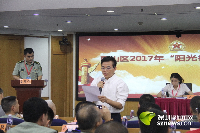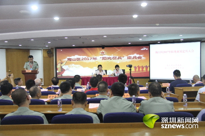 深圳新闻网讯 (记者 董非)根据南山区2017年征兵工作计划安排,9月6日下午,南山区召开了2017年度阳光征兵定兵会,深圳警备区动员处田飞中校,南山区副区长谢炳文,市征兵工作督导组、区征兵工作领导小组成员单位、区征兵办的相关负责人,全区各街道(院校)专武干部、民兵干部,应征青年和家长代表参与了会议。