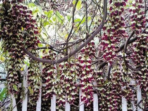 禾雀花很怪,藤条缠在别的树干生长,藤条上挂满雀花,密密麻麻,一群一群的,就像一串串葡萄挂在藤上。