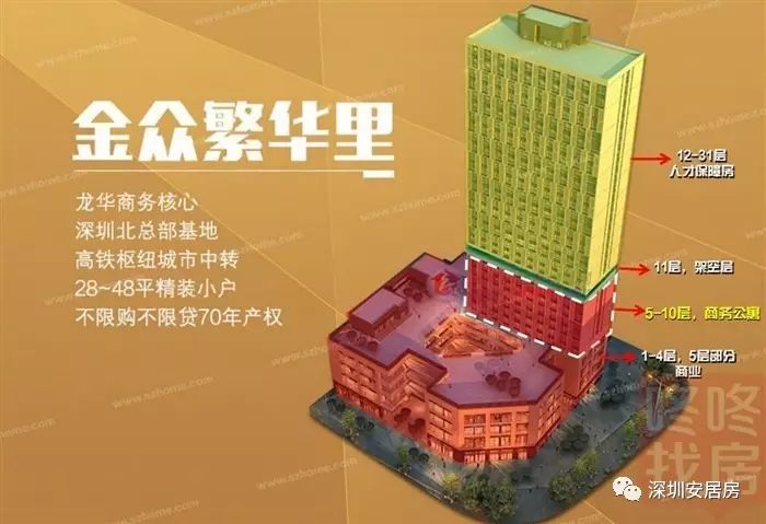 从上图我们可以看到,1-4层商铺(5层一侧少量商铺),5-10层商务公寓,11层架空层,12层-31层为保障房。