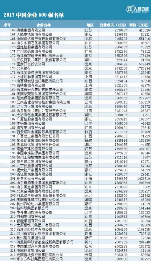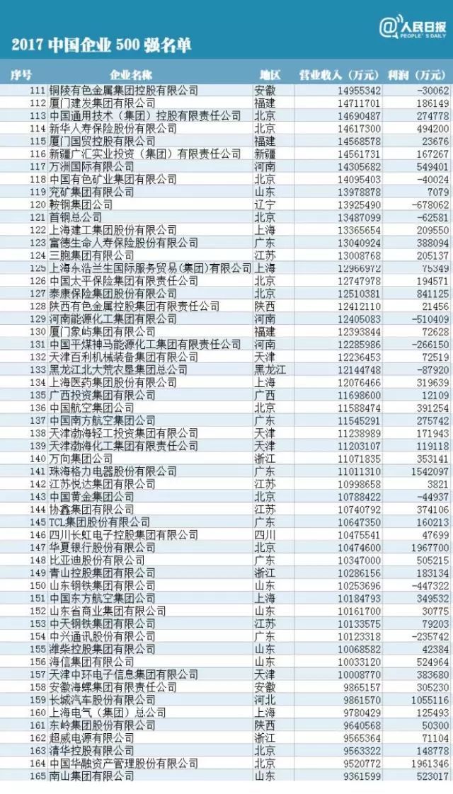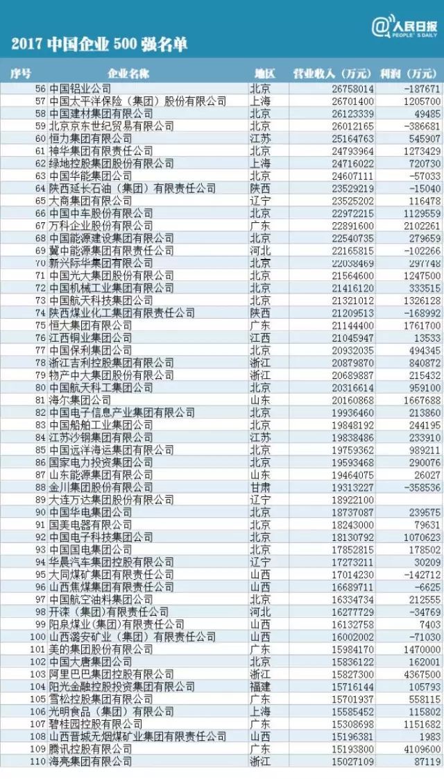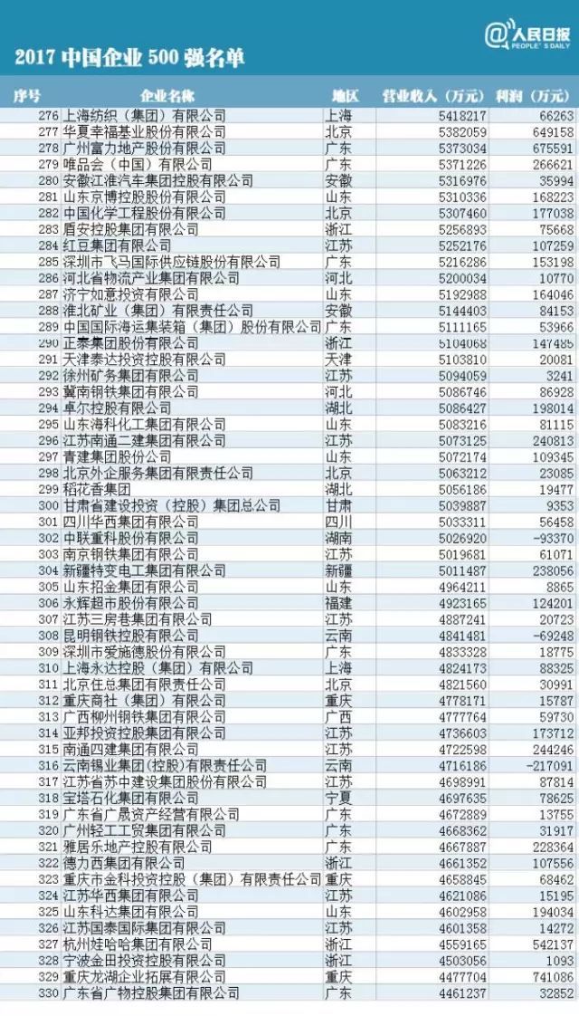 非也。2017中国企业500强中,亏损企业有43家,亏损面为8.6%,亏损面较上年的14.4%大幅下降;43家企业的亏损额达到576.23亿元,较上年也大幅下降。这43家亏损企业中,煤炭企业10家(较上年减少7家)、钢铁企业8家(较上年减少13家)、有色8家(较上年减少3家)。可见煤炭、钢铁等重点行业的“去产能”成效显著。
