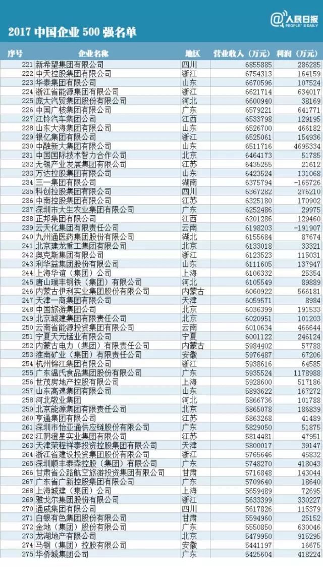 2017中国企业500强的入围门槛为营业收入283.11亿元,达到历史新高,较上年大幅提高了39.65亿元,提高幅度是自2002年发布中国企业500强以来以来最大的。