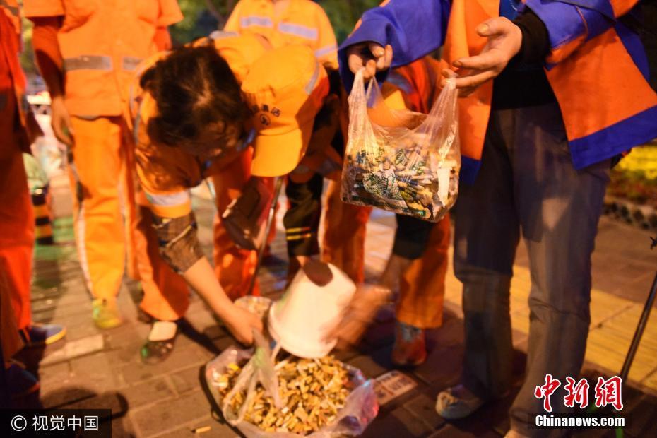 17名保洁员一天捡六千多烟头 负责路段内烟头超标会被罚款