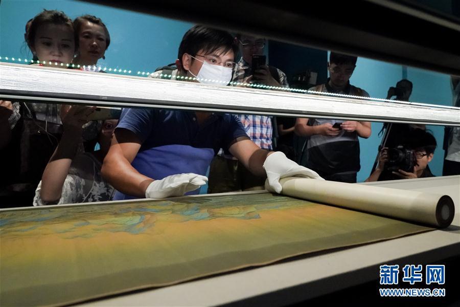 9月11日,故宫博物院的工作人员将《千里江山图》布置到展柜中。