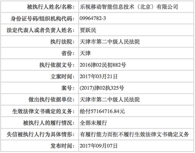 乐视移动涉及的案号为(2017)津02执325号,生效法律文书确定的义务为给付5716万元,同样,乐视移动也全部未履行,且具体情形为:有履行能力而拒不履行生效法律文书确定义务。