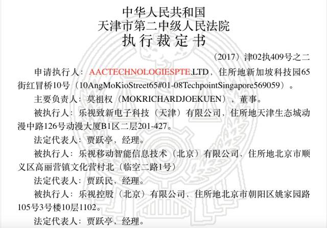 小编根据失信被执行人名单案号查询中国裁判文书网发现,(2017)津02执409和(2017)津02执325号两起案件分别是常州丽声科技有限公司和AAC TECHNOLOGIESPTE.LTD对乐视方面提起的诉讼。