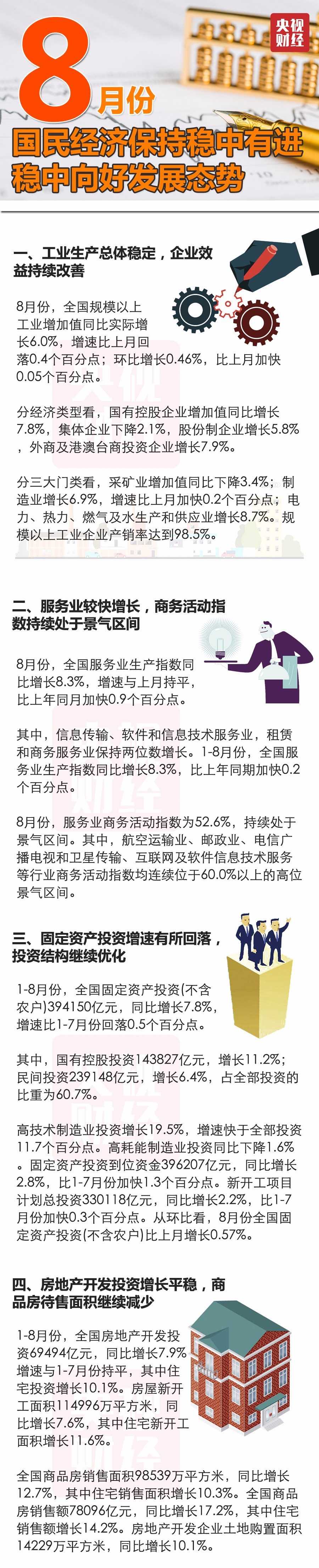 8月份,全国规模以上工业增加值同比实际增长6.0%,增速比上月回落0.4个百分点; 8月份,社会消费品零售总额30330亿元,同比增长10.1%,增速比上月回落0.3个百分点; 1-8月份,全国固定资产投资(不含农户)394150亿元,同比增长7.8%,增速比1-7月份回落0.5个百分点。