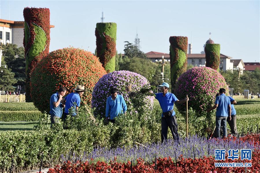 9月17日,工人在布置天安门广场两侧的绿地。新华社记者罗晓光摄