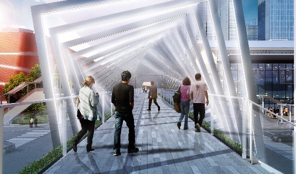 设计以简洁大方,科技互动为理念。天桥以简洁的三角形变形体为基础造型,通过旋转、变形等方式形成连续起伏的动感形态,有着强烈的视觉效果。充满韵律感的造型结合了互动灯光以及喷雾降温等科技智能化装置,让市民在穿行的过程中有着舒适、新奇的体验。