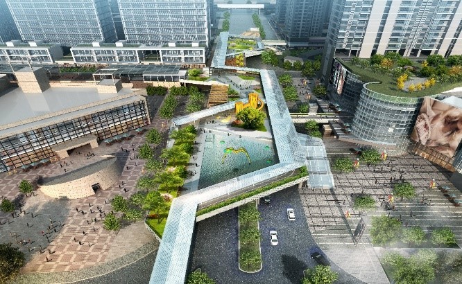 2号天桥将世贸百货与万科广场、天誉、天誉实验学校等物业相连,设计理念为漂浮的绿洲,通过片区人群活动分析,在人群最活跃的位置设计一个漂浮的二层绿色平台。在城市的高密度区,沿市民上班上学、娱乐休闲的路径上,创造了一个绿色生态的休闲公园。公园依照出行路径划分出若干大小不一的区域,提供了喷雾戏水广场、儿童游乐广场、休闲绿洲、露天小剧场等供市民活动体验的区域,将天桥的功能多元化复合化,打造一个多层次绿色生态体验的都市空间。