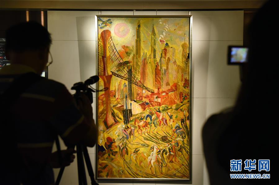 9月21日,在香港苏富比预展上,传媒拍摄油画《工业之轮在纽约》。当日,香港苏富比在香港展出旅美华人、现代艺术家朱沅芷的巨幅油画作品《工业之轮在纽约》。该作品为本季秋拍现当代艺术领域估值最高的一幅画,估价为0.8亿至1.2亿港元。朱沅芷为首位获邀参展纽约现代美术馆的华人艺术家。这幅长逾两米、宽逾一米的油画创作于1932年,当时纽约现代美术馆因乔迁重新开幕,朱沅芷等艺术家应邀以“战后的世界”为主题创作并参展。新华社记者秦晴摄