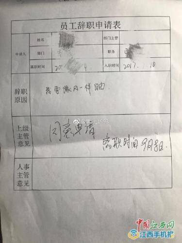网友“露宝_1993”发微博:“我家客服离职,好有个性。”并配有一张“离职员工申请表”,这位辞职客服在申请表上辞职原因一栏写着:“我要像风一样自由”。