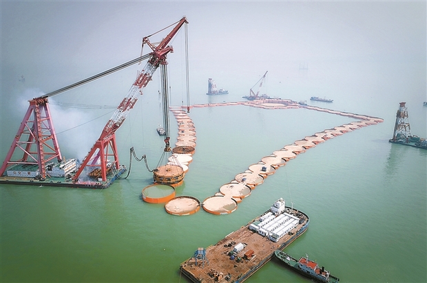 今年5月1日,深中通道西人工岛首个高38.5米、直径28米、重量达637.43吨的超级钢圆筒顺利振沉、扎根珠江,为粤港澳大湾区发展打下坚实支撑。4个月时间内,深中通道项目在西人工岛顺利振沉共57个钢圆筒,高标准、高质量、高效率地迅速在汪洋大海上创造陆域,初步勾勒出西人工岛“海上风筝”的优美轮廓。