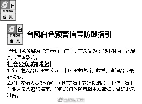 深圳新闻网讯 深圳市发布台风白色预警。深圳市气象台于2017年10月13日16时00分在全市发布台风白色预警,预计台风“卡努”将可能在48小时内影响我市,全市进入台风注意状态,遵照海事、渔政部门的防风指令或通知,做好避风准备。