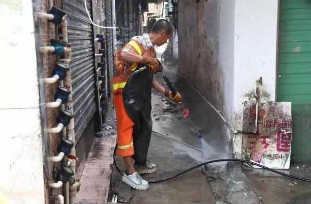 环卫工在背街小巷进行消杀工作