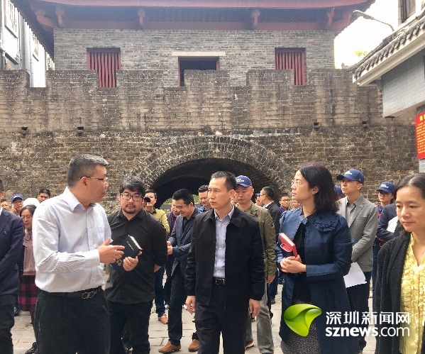 曾湃一行从南头古城正大门进入,沿路查看了历史悠久的南头古城墙、东莞会馆和广州府宝安县衙门等旧址及“双年展”施工场地,了解古城保护工作的进展情况。古城保护工程相关负责人详细汇报了古城改造方案及改造情况。调研中,曾湃对古城的修复和保护工作表示肯定,同时强调“双年展”改造工程要抓紧施工进度、注意施工安全,确保改造工程如期进行,保证深港城市建筑双城双年展的成功举办。