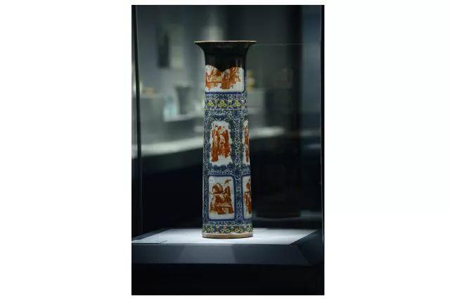 8. 蓝料开光矾红人物故事图桶瓶