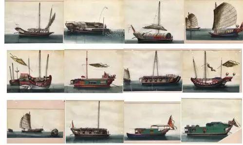 ▲此册通草纸水彩画描绘各式船舶12张,是当时珠江水面所见到的不同用途船只的真实写照,反映当时繁忙的贸易往来