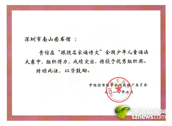 南山图书馆也喜获“跟随名家诵诗文”全国少年儿童诵读大赛、“穿越千年 感受经典”中华经典主题亲子阅读系列活动和“经典流芳”主题荐读活动三个“优秀组织奖”。