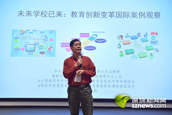 教育部教育管理信息中心预测与评价处处长周一,华东师范大学教授祝智庭,南山区政协副主席、教育局局长刘根平,中国教育智库网总负责人、未来学校研究院院长郑德林,北京师范大学教育学部、数字学习教育部工程中心副主任李玉顺,广东省教育厅基础教育与信息化研究员林君芬博士,未来学校研究院综合办公室主任牛志强和深圳市教育信息技术中心副主任张惠敏等专家学者出席了会议并进行分享。