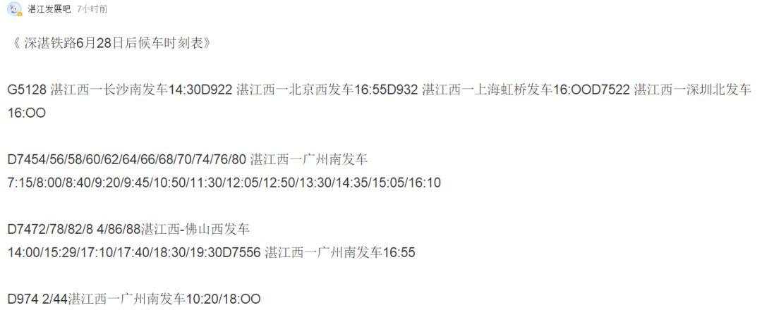 名为“湛江发展吧”的微博网友在网上贴出了《深湛铁路6月28日后候车时刻表》,显示深湛铁路开通后不仅有湛江西往返佛山西、广州南、深圳北的动车,还有湛江西直达长沙南、北京西以及上海虹桥的高铁列车。帖子的具体内容为: