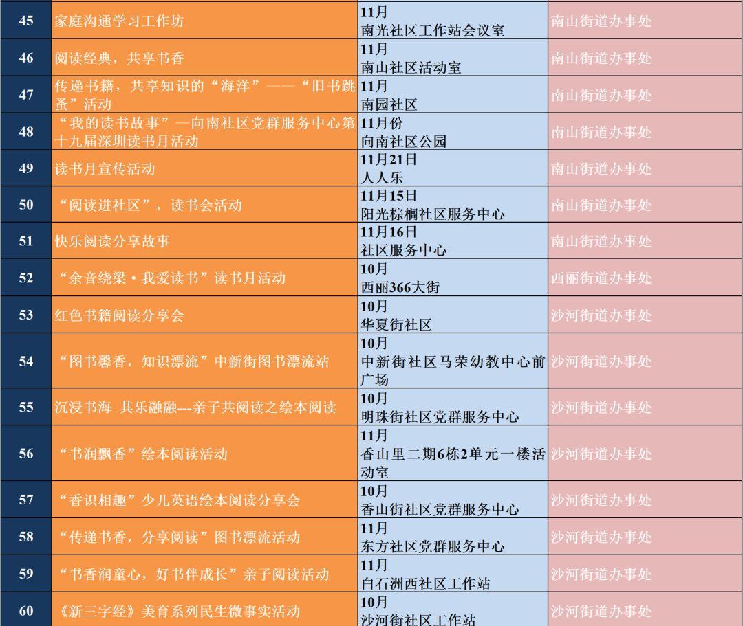 在读书月期间,南山区委宣传部将联合深圳书城南山城组织开展移动书车绘本进社区、进学校活动,深入南山区基层进行书籍展销,传播区委区政府的文化关怀,丰富市民文化生活。