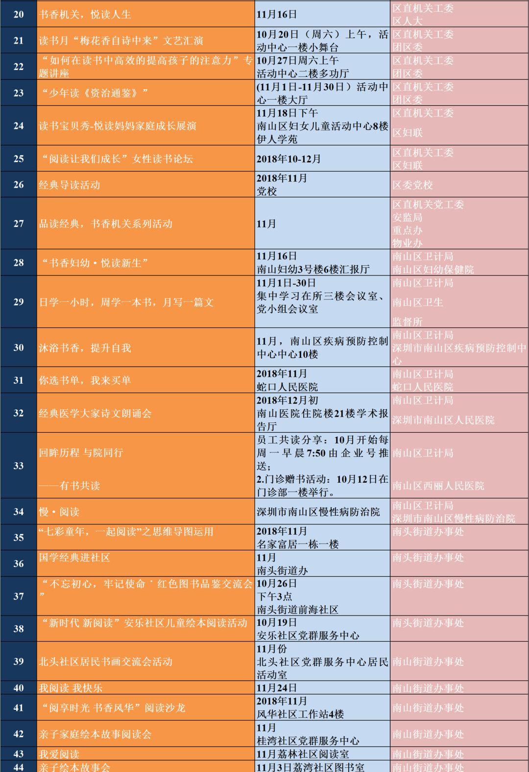 此外,读书月期间南山还将举办“悦读有约”、“首届中国自然好书奖”颁奖典礼、跟名师读名著、陈平原《左图右史与西学东渐》新书发布会、国学经典进社区,名著泉涌、声染桃源读剧活动等,通过不同方式的阅读活动,营造浓厚氛围,丰富南山居民的文化生活。