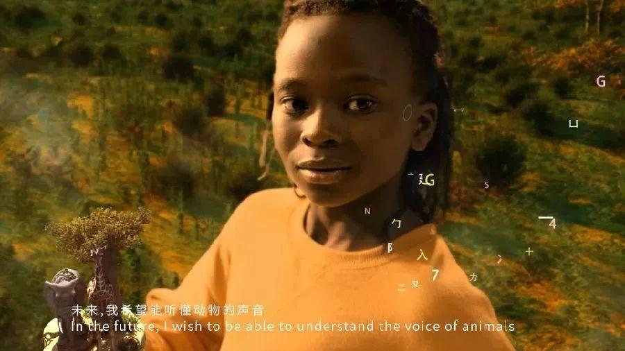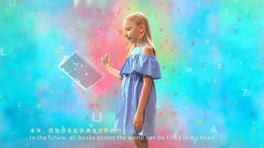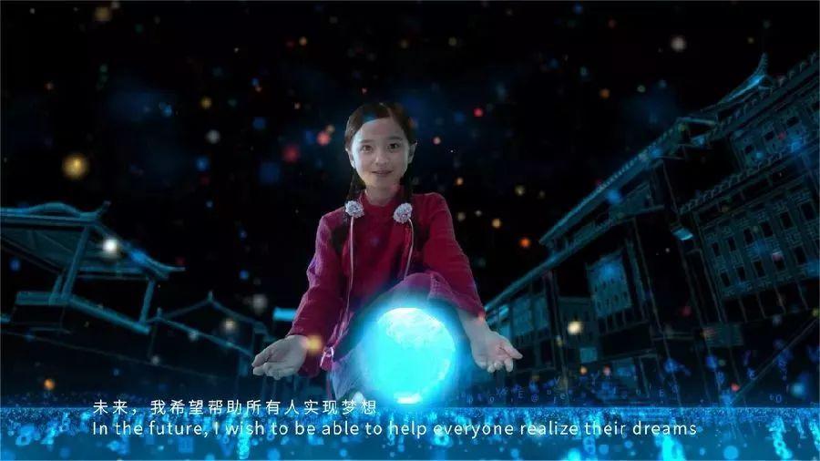 一名中国女孩出现在了极具科幻感的场景中,随着她的一句“未来,我希望帮助所有人实现梦想”,梦想汇集成了一个能量球,并在流动的数据流中幻化成了代表着友谊与和平的荷花。