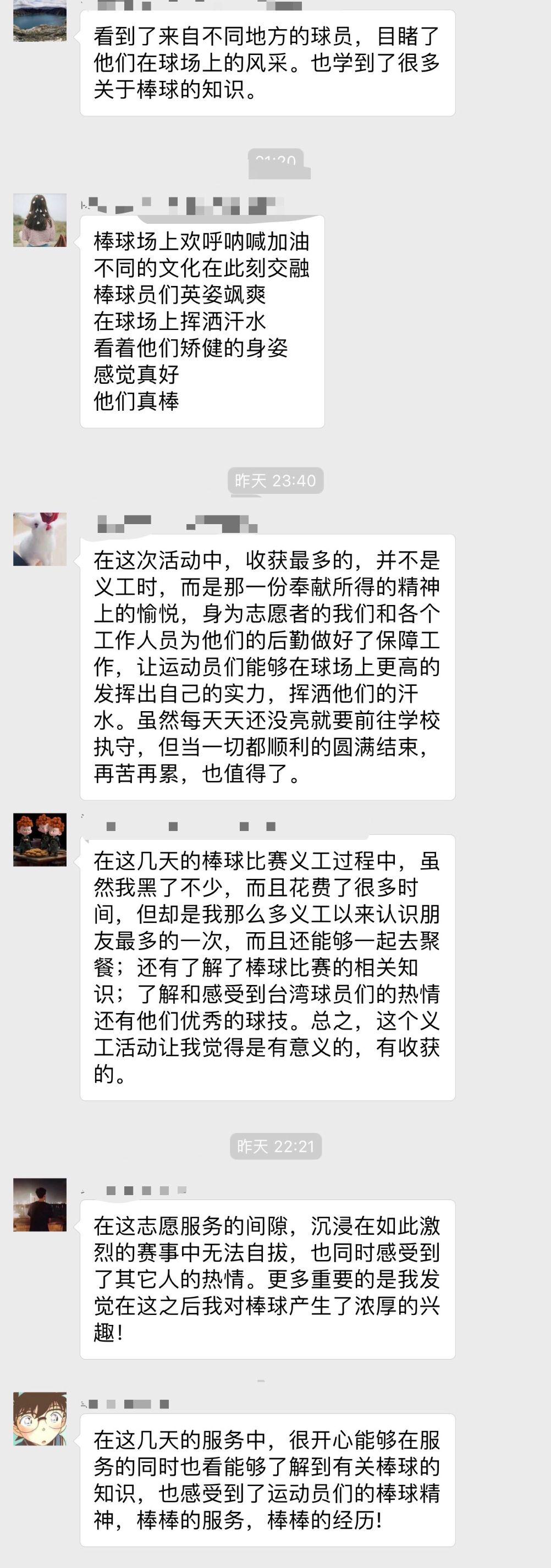 来自南方科技大学、哈尔滨工业大学(深圳)、深圳大学、暨南大学深圳旅游学院、深圳职业技术学院、新安职业技术学院、博伦职业技术学校、深圳市体育义工总队、南山区义工联的志愿者们组成了一片红色的海洋。为了更好地适应赛场,内外包含随车、接送站、媒体、医疗、检票等方面近30个岗位的志愿服务工作,在准备期间,志愿者们还接受了棒球知识介绍、服务礼仪、应急救助等方面的培训。共计1077名志愿者参与本届赛事服务,其中,8个赛场内共有470名,643人次志愿者在媒体、医疗、检票等岗位开展志愿服务。赛场外,共有607名1448人次志愿者在随队、接送站、选手之夜等岗位参与志愿服务。