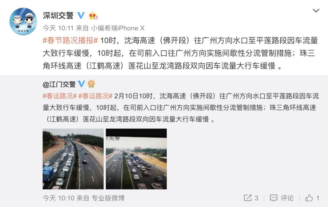 10时,沈海高速(佛开段)往广州方向水口至平莲路段因车流量大致行车缓慢,10时起,在司前入口往广州方向实施间歇性分流管制措施;珠三角环线高速(江鹤高速)莲花山至龙湾路段双向因车流量大行车缓慢 。