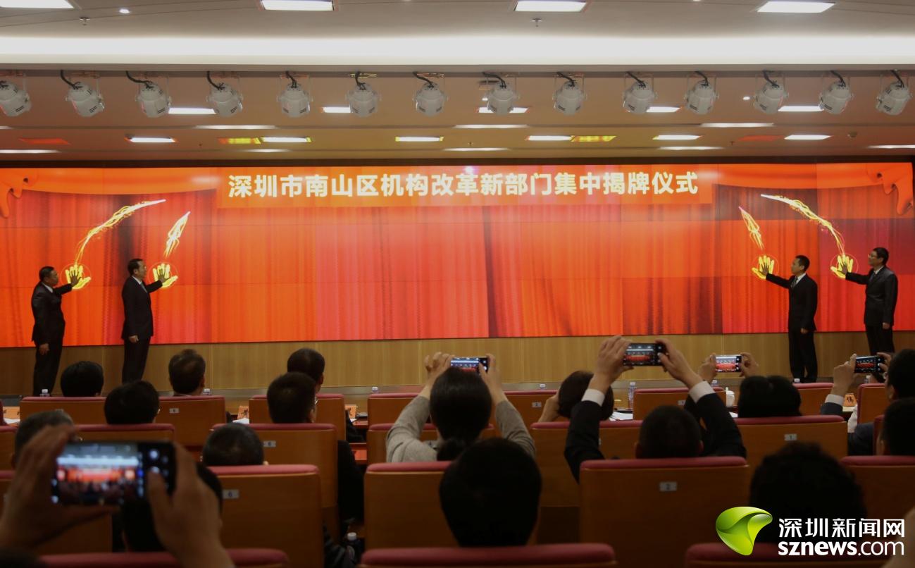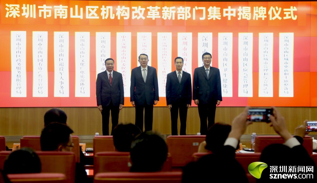 深圳新闻网讯(记者 曹文丽 董非)3月19日,南山区举行机构改革新部门集中揭牌仪式。南山区委书记王强,区长曾湃,区人大常委会主任麦林光,区政协主席陈军共同为14家新部门揭牌。