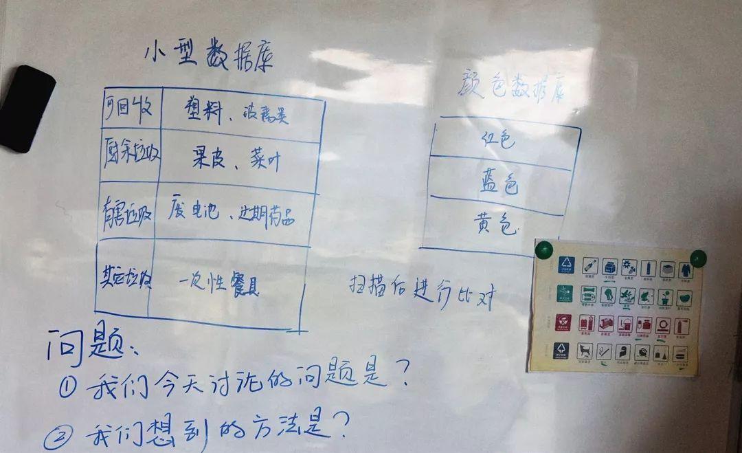 确定了垃圾归为几类之后,孩子们进行了多次讨论,却发现最初的想法很难实现。但是他们并没有放弃,而是将方案进行了调整:制作4个垃圾桶,让IPAD告诉你扔到哪个垃圾桶里。