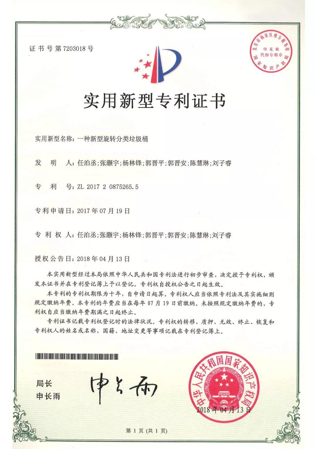 小创客团队接到国家专利证书——“一种新型旋转分类垃圾桶”。