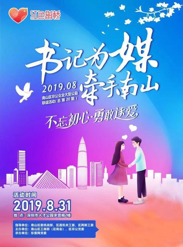 8月31日,“书记为媒 牵手南山”大型公益联谊活动(总第20期)启动仪式在深圳市人才公园求贤阁举办,来自政府机关、事业单位、区非公党委直属企业及腾讯、海能达、迈瑞、前海人寿等非公企业的120名单身青年参加了活动,12对青年男女在活动中完成初次牵手。作为“红色鹊桥”系列公益活动之一。