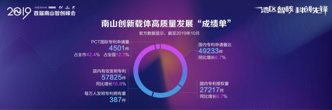 官方数据显示,截至2019年10月,南山区在科技创新方面,国内专利申请量达49233件,同比增长6.7%;国内专利授权量27217件;国内有效发明专利57825件,同比增长15.8%,每万人发明专利拥有量387件;PCT国际专利申请量4501件,占全市42.4%,占全国12.3%。